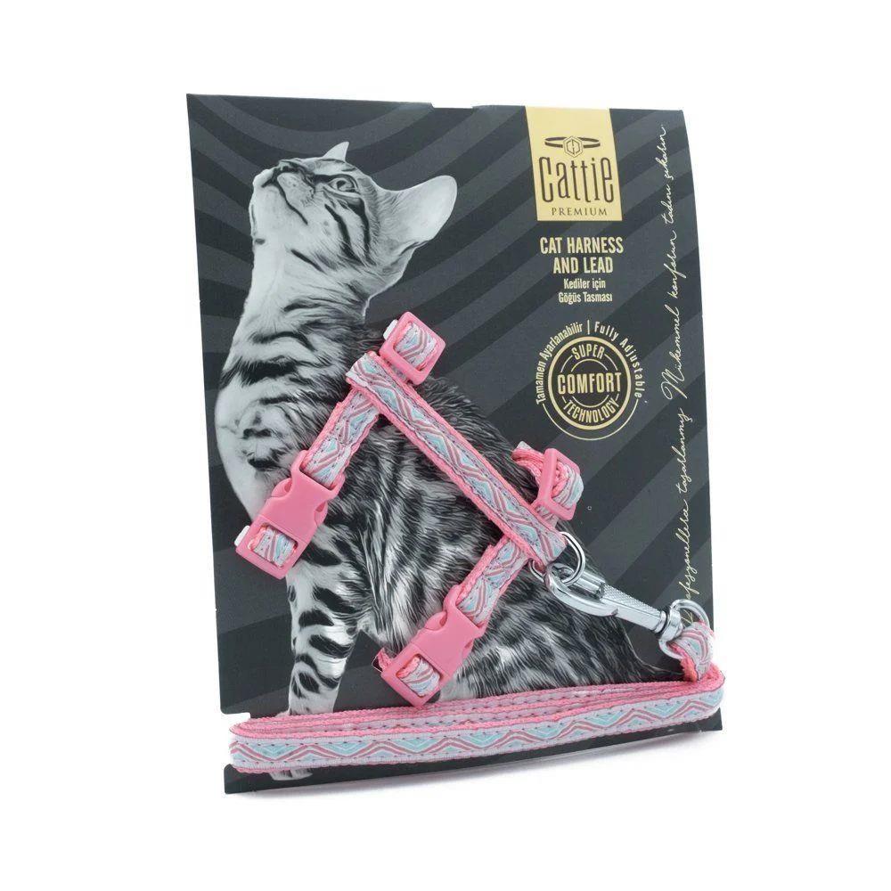 Cattie Özel Desenli Dokumadan El Yapımı Kedi Göğüs & Gezdirme Takımı Pink