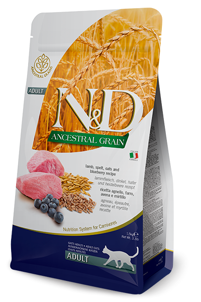 N&D ANCESTRAL GRAIN Kuzu, kılçıksız buğday, yulaf ve yaban mersini. Yetişkin kediler için formüle edilmiş tam mamadır. 1.5kg