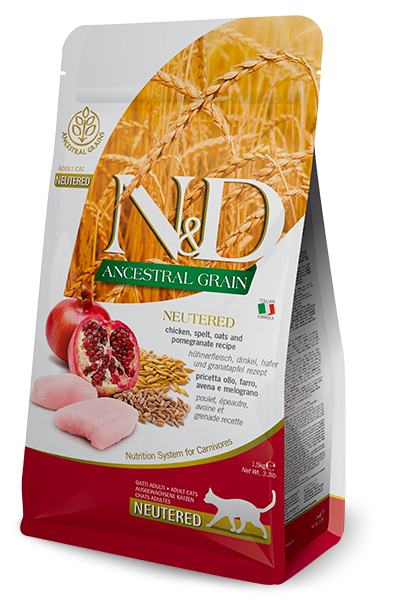 N&D ANCESTRAL GRAIN Tavuk, kılçıksız buğday, yulaf ve nar. Yetişkin kısırlaştırılmış kediler için formüle edilmiş tam mamadır. 1.5kg