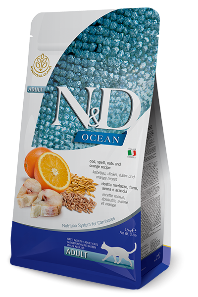 N&D OCEAN Morina balığı, kılçıksız buğday, yulaf ve portakal. Yetişkin kediler için formüle edilmiş tam mamadır.1.5kg