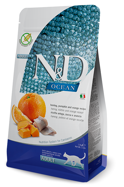 N&D OCEAN Ringa balığı, balkabağı ve portakal. Yetişkin kediler için formüle edilmiş tam mamadır.1.5kg