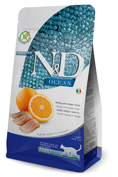 N&D OCEAN Ringa balığı ve portakal. Yetişkin kediler için formüle edilmiş tam mamadır. 1.5kg