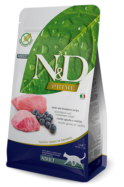N&D PRIME Kuzu ve yaban mersini. Yetişkin kediler için formüle edilmiş tam mamadır.1.5kg