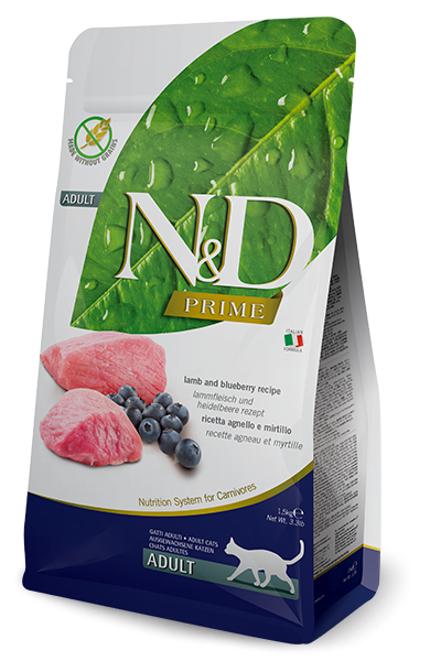 N&D PRIME Kuzu ve yaban mersini. Yetişkin kediler için formüle edilmiş tam mamadır.1.5kg