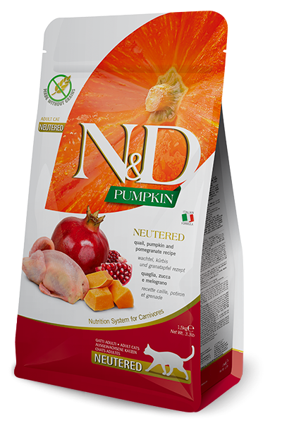 N&D PUMPKIN Bıldırcın, bal kabağı ve nar. Yetişkin kısırlaştırılmış kediler için formüle edilmiş tam mamadır. 1.5kg