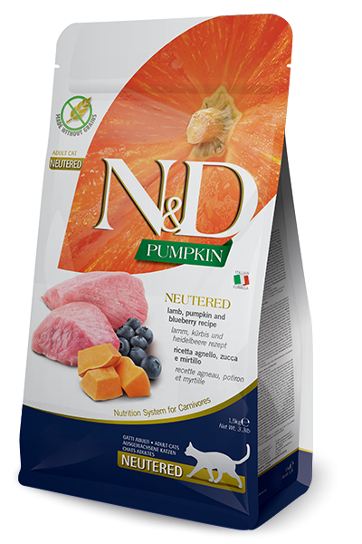 N&D PUMPKIN Kuzu, balkabağı ve yaban mersini. Yetişkin kısırlaştırılmış kediler için formüle edilmiş tam mamadır. 1.5kg
